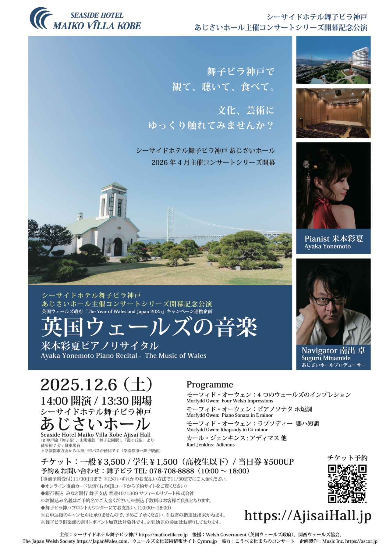 英国ウェールズ政府による日本とウェールズ両国間の更なる友好と発展を目指す「The Year of Wales and Japan 2025」キャンペーン連携企画として、ウェールズで育った神戸出身のクリエイター・音楽プロデューサー南出卓(あじさいホールプロデューサー)がお届けする、ピアノスト米本彩夏による